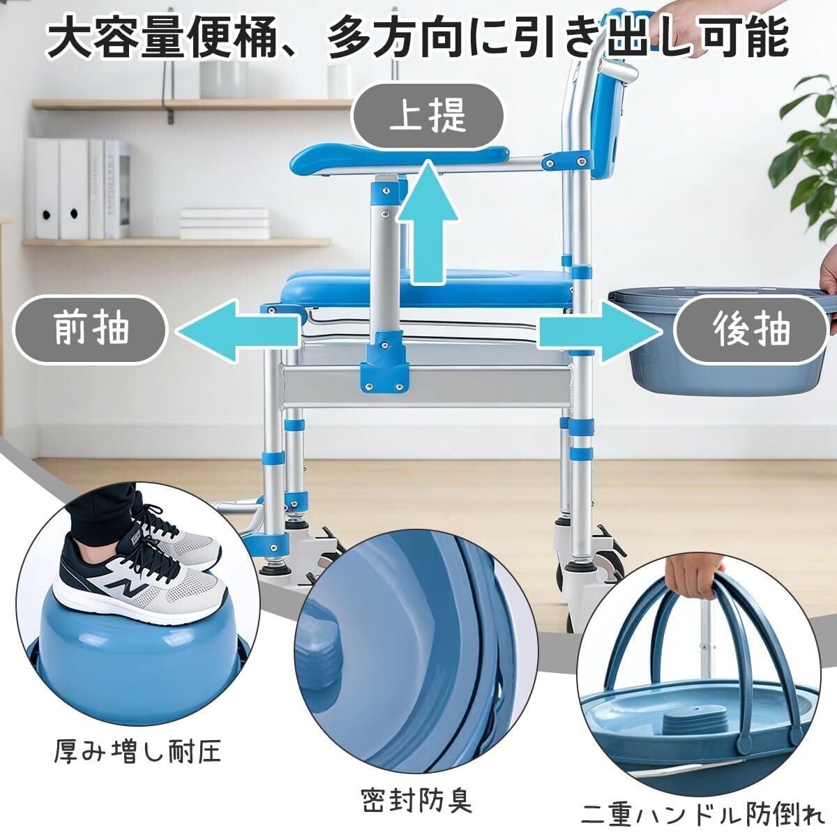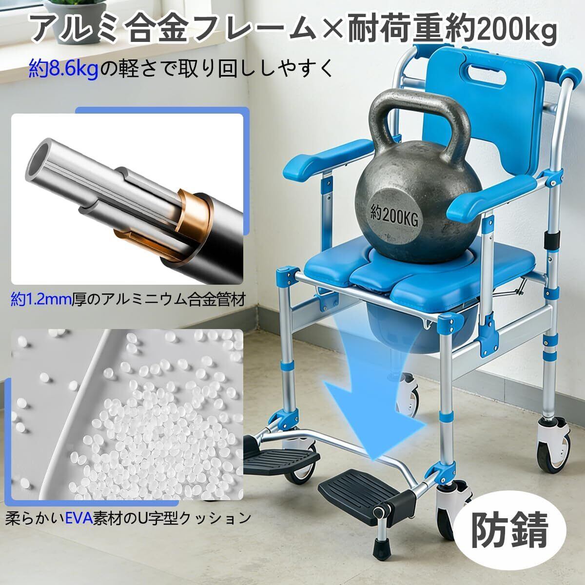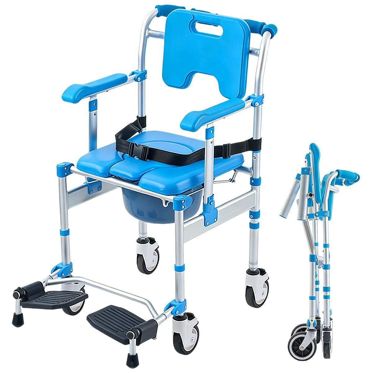 【特価商品】介護用車椅子 入浴・トイレ兼用 折りたたみ式 シャワーチェア 自在キャスター ブレーキ付き 3 段階高さ調整可能 フットレスト付き ソフト座面 介助用 軽量設計 耐荷重約 200kg 防水仕様 高齢者用 障がい者用 福祉用品 リハビリ対応 日本語説明書付き(ブルー、幅 50.5× 奥行 76× 高さ 91–97cm)