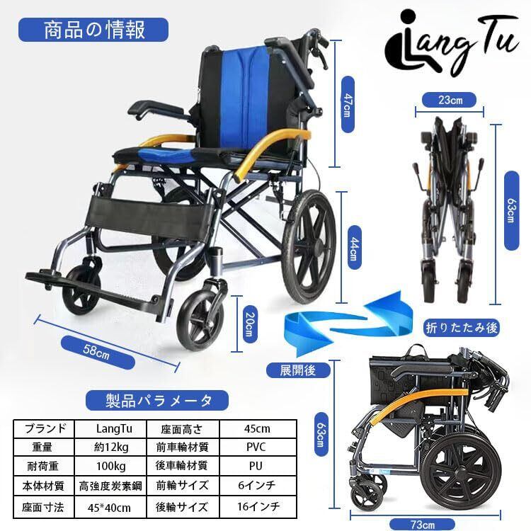 LangTu車椅子 折りたたみ 介助型車椅子 軽量車椅子 四輪歩行車 高耐荷重 100kg 持ち運び易い手押し車 背折れタイプ 透気性 介護用品 介助型簡易式車椅子 高齢者 妊婦向 け日本語の説明書付 き旅行用 外出用車イス
