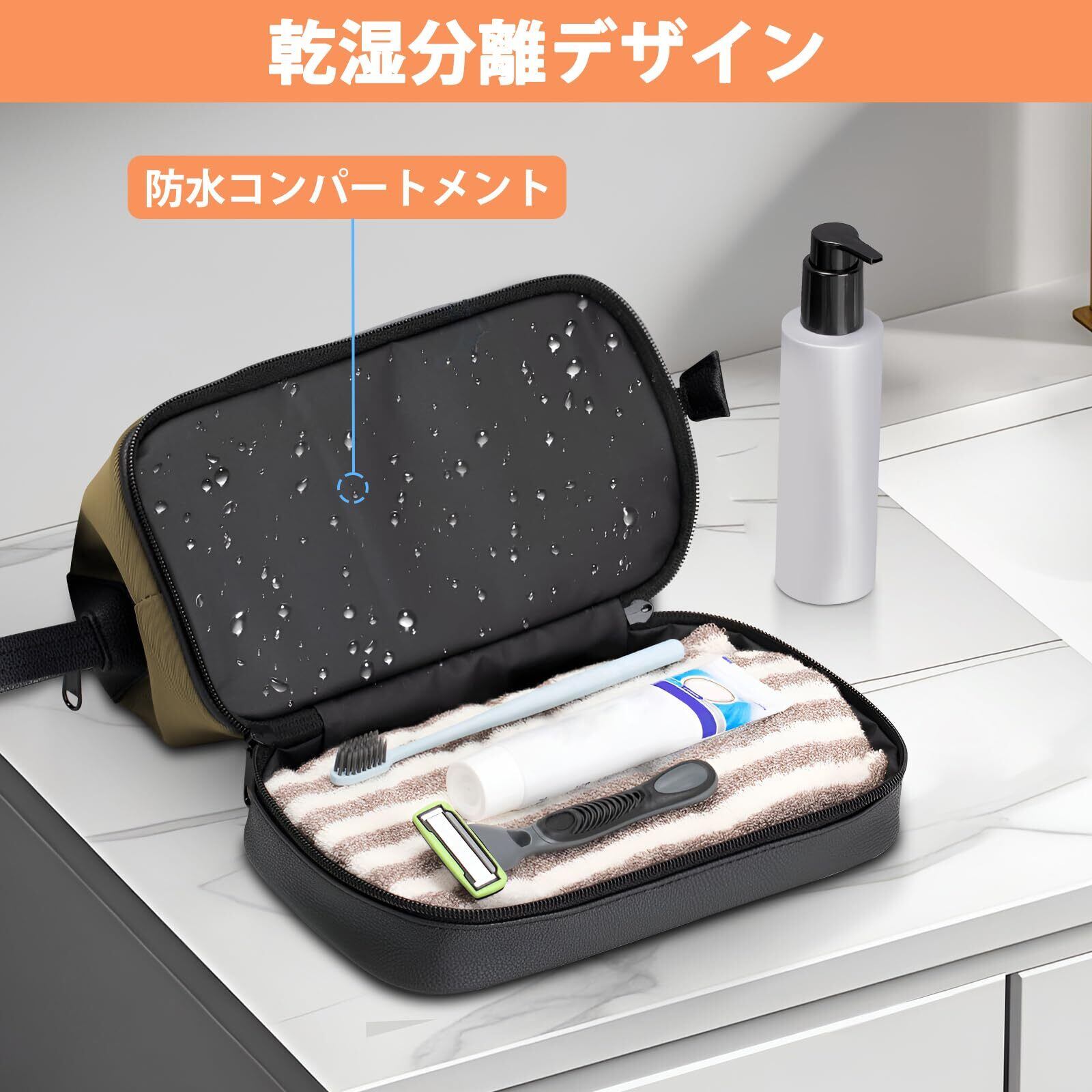 Lermende 大容量 トラベルポーチ メンズ用 洗面用具 ポーチ ナイロンとPUレザー 化粧ポーチ 防水 乾湿分離 トイレタリーバッグ 多機能 旅行用ポーチ 夫や父への贈り物 (カーキ)