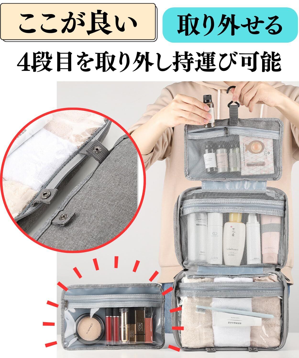 旅行 便利グッズ トラベルポーチ メイクボックス 吊り下げ収納 コスメ収納 吊り下げ 可愛い スキンケア 防水 小型 入院 大容量 旅行用 小物入れ 吊るせるポーチ (グレー)