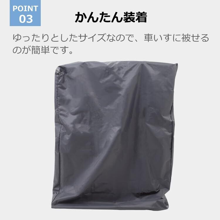 ①撥水加工で雨や埃などの汚れから大事な車イスを守ります。 家屋内に収容できずに室外に置いている車椅子におススメです。