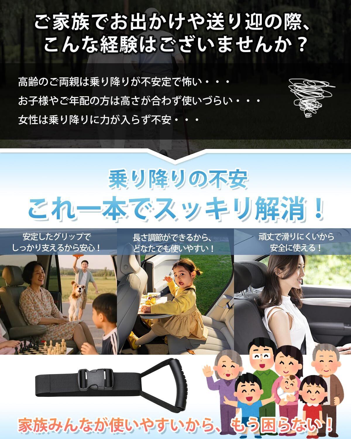 【乗り降りをしっかりサポート】介護福祉士監修の車用持ち手。乗り降り時の体を支える補助グリップとして、お年寄り・妊婦さん・お子様など、足元が不安定な方に安心してご利用いただけます。転倒防止にも役立つ心強いアイテムです。※本製品はあくまで補助目的のアイテムのため、無理な体重負荷はお控えください。