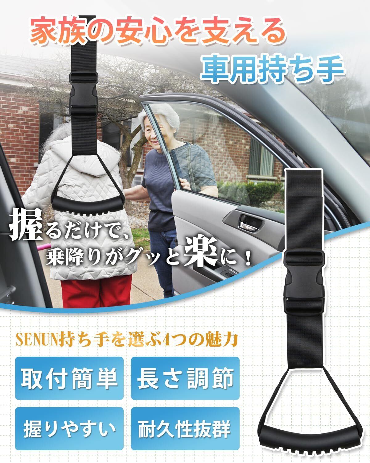 【特価商品】SENUN 車用持ち手 乗り降り 手すり (手のひらにフィット!丈夫なストラップタイプ) 車 つり革車 サポート お年寄り ドア 後部座席 吊り つりさげ式 乗り降り グリップ 持ち手 ブラック