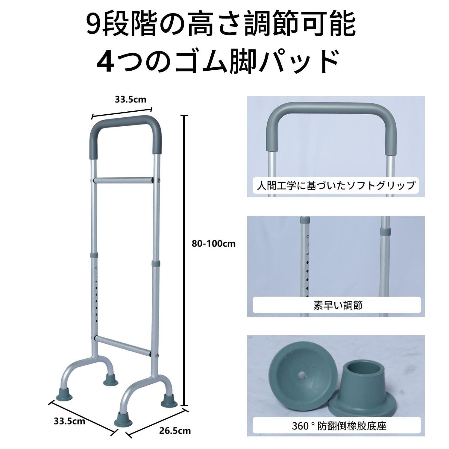 介護用手すり 立ち上がり補助器具 トイレてすり 高さ調整 滑り止め付き 床 補助 つかまり立ち 転倒防止 玄関 室内 屋内 屋外 グレー 銀