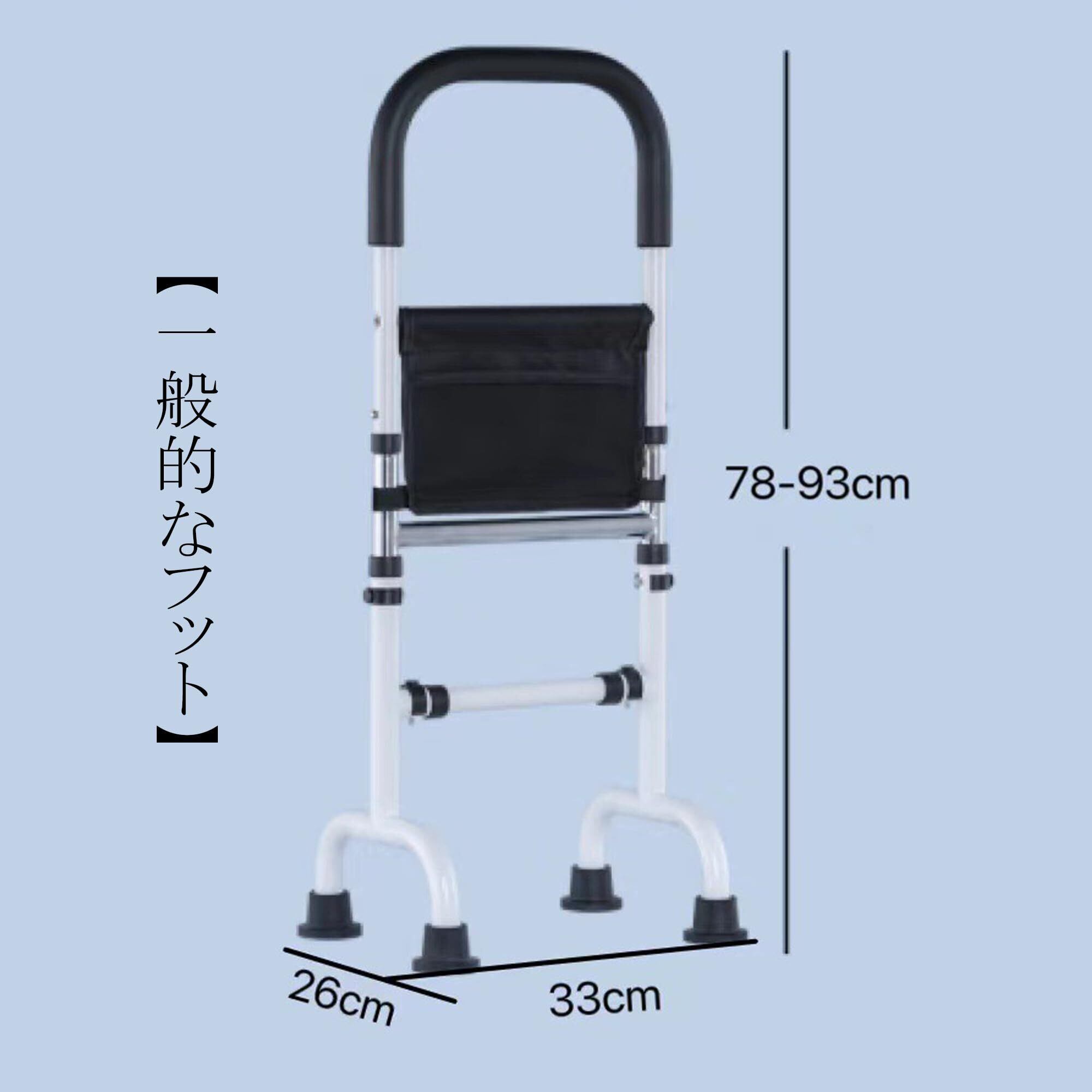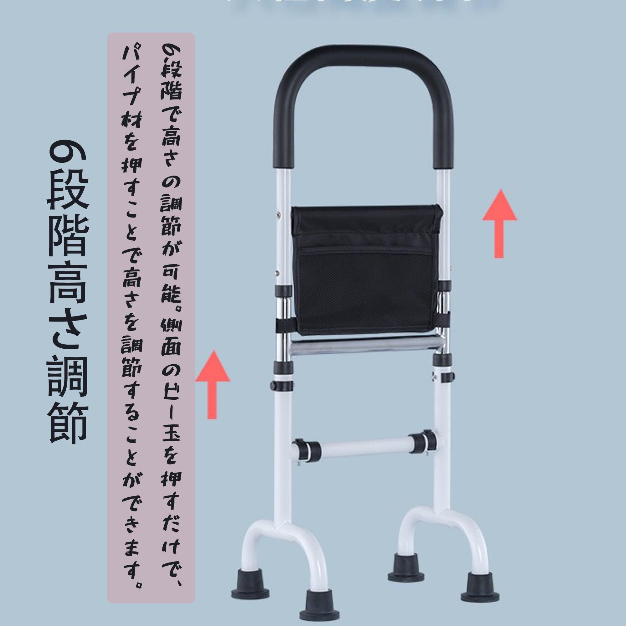 【高さ6段階の手すり】:6段階で高さの調節が可能。側面のビー玉を押すだけで、パイプ材を押すことで高さを調節することができます。椅子や座椅子に合わせて高さを変えられます。(一般的なフットと吸盤フットのサイズには少し違いがあるので、ご注意してください。)適用身長140cm-190cmです。