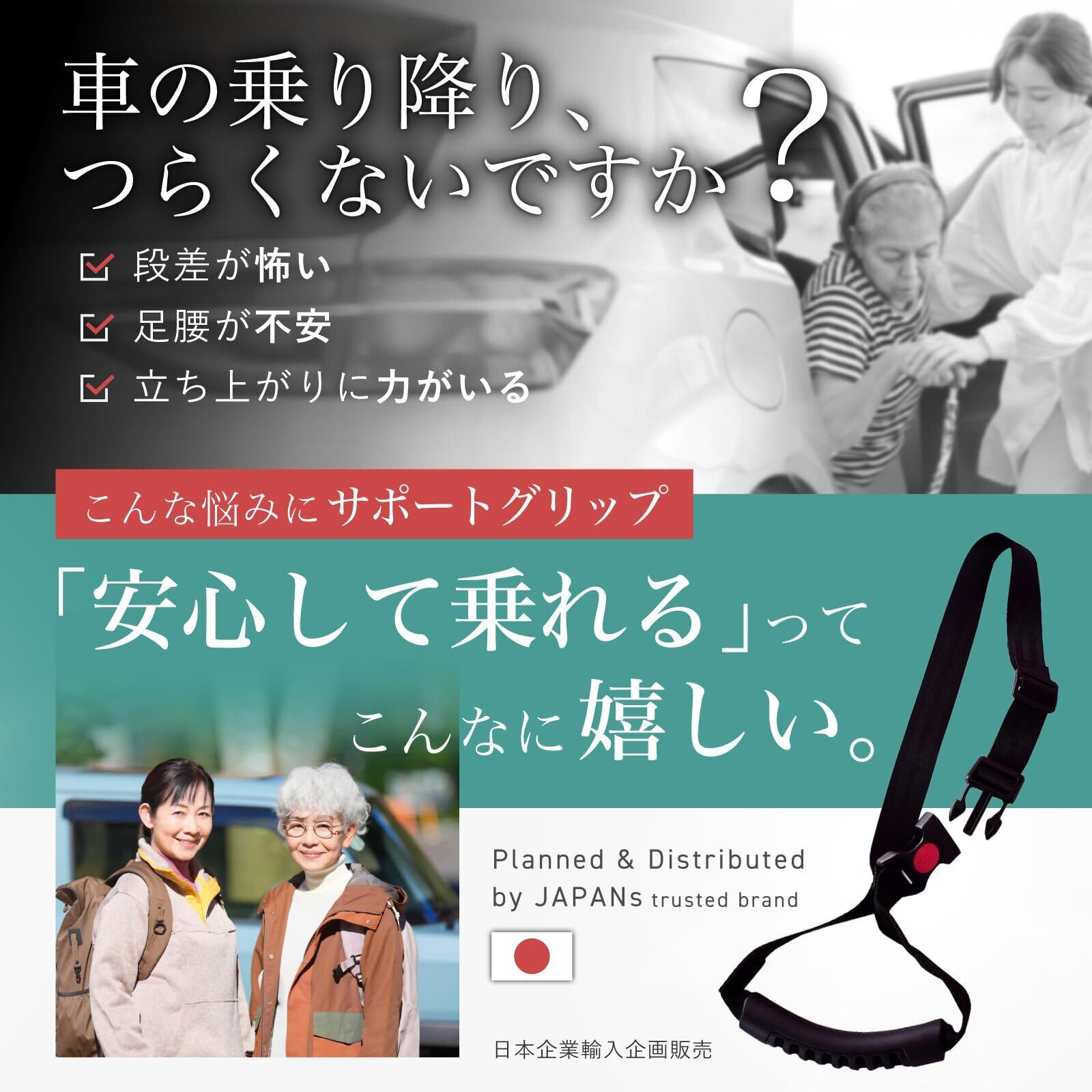 【車用持ち手】車の乗り降り時に不安を感じる高齢者の方、妊婦さん、腰痛や膝の痛みを抱える方、足元が不安定な方のために開発された、取り付け簡単な乗降補助用サポートグリップです。車内のアシストグリップ(つり革状の取っ手)に通して使用するタイプで、工具不要・ワンタッチで取り付け可能なので、力に自信のない方や女性でも扱いやすく、日々の移動を少しでも楽にしたいという方にぴったりの補助アイテムです。