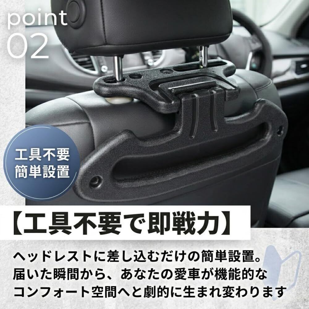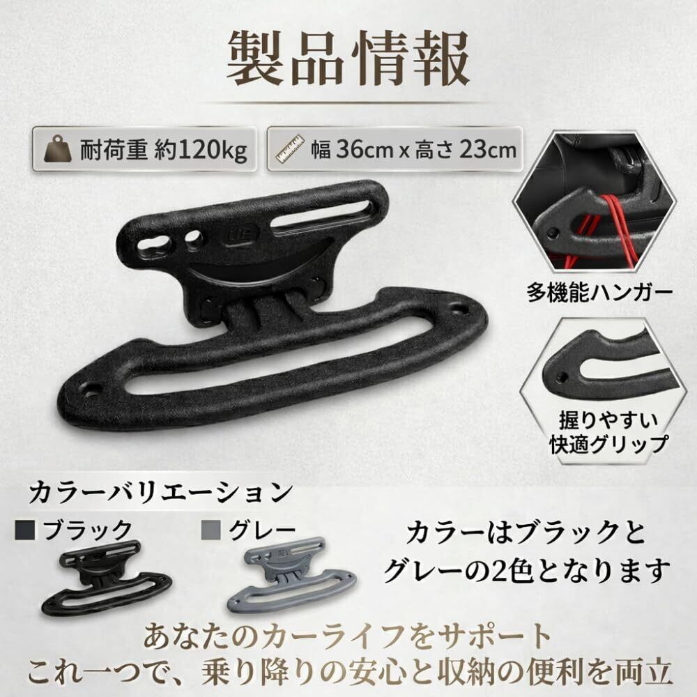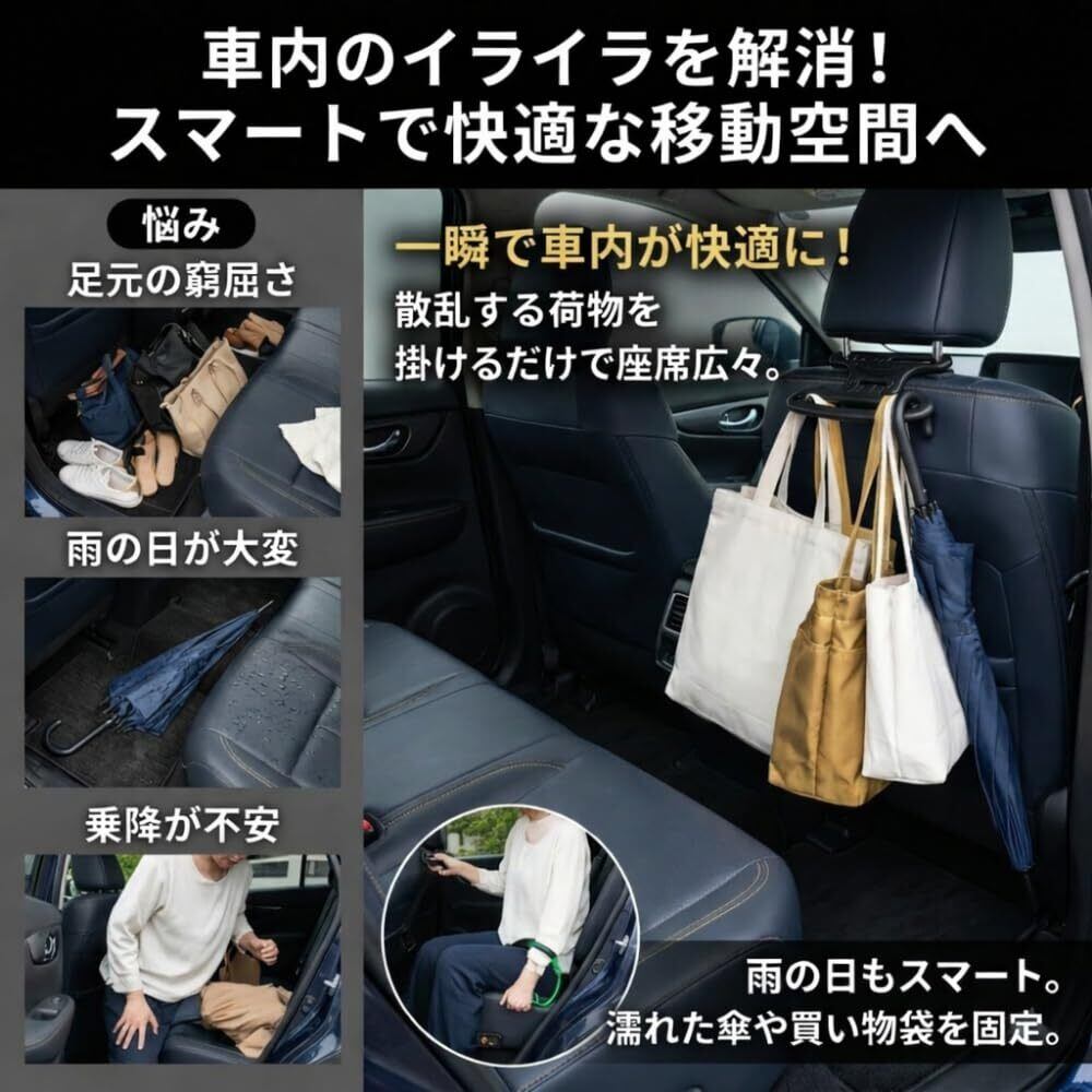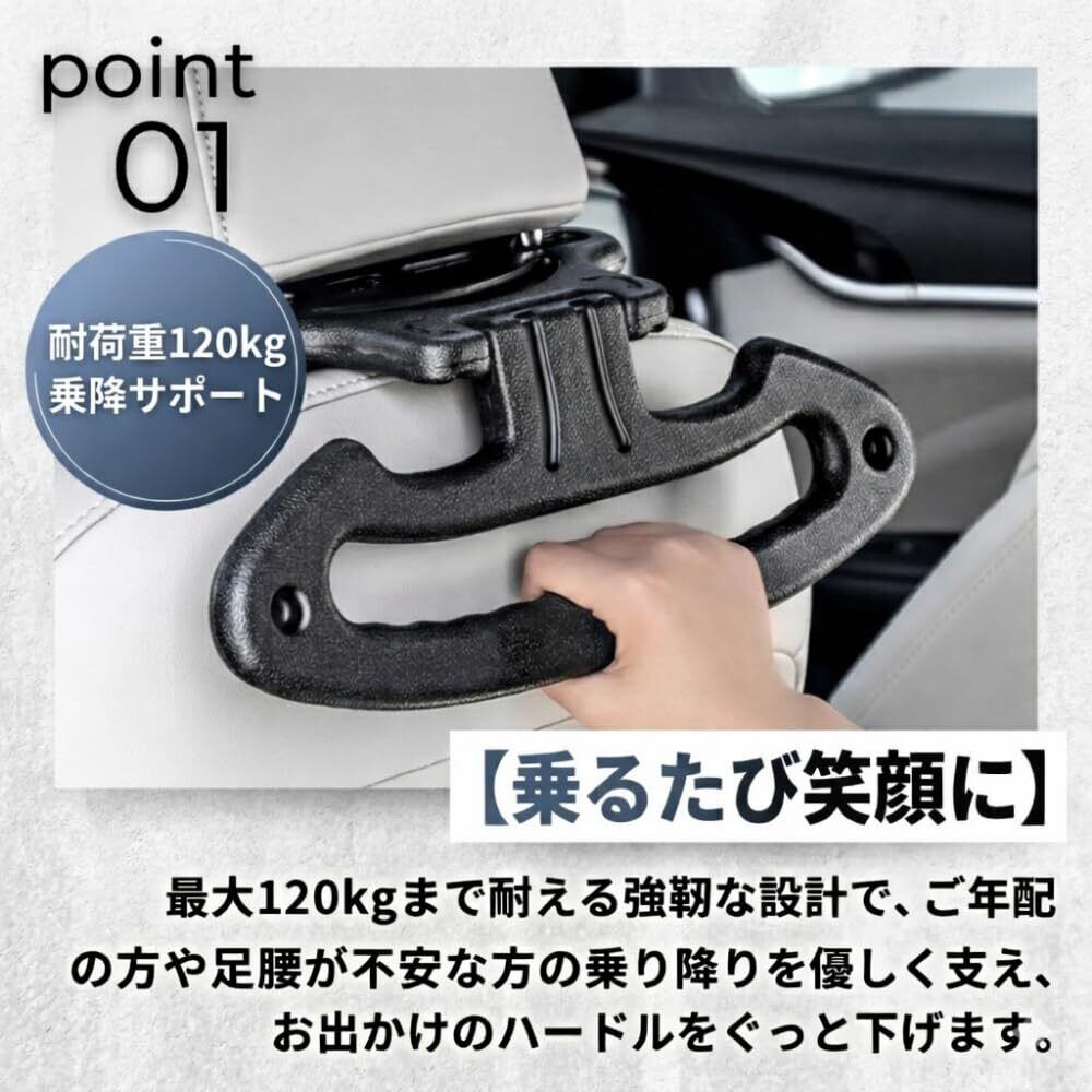 【乗るたび笑顔に】最大120kgまで耐える強靭な設計で、ご年配の方や足腰が不安な方の乗り降りを優しく支え、お出かけのハードルをぐっと下げます。【工具不要で即戦力】ヘッドレストに差し込むだけの簡単設置。届いた瞬間から、あなたの愛車が機能的なコンフォート空間へと劇的に生まれ変わります。【一瞬で車内が快適に】散らかりがちなバッグや買い物袋をサッと掛けるだけで、座席が広々。足元の窮屈さから解放され、移動中もゆったり寛げます。【洗練された車内演出】無駄を削ぎ落としたスタイリッシュなデザインが、内装に自然に馴染みます。実用性と美しさを両立し、愛車の格を一段引き上げます。【雨の日もスマートに】濡れた傘や買い物袋をスマートに固定。車内を汚すことなく、雨の日の憂鬱な移動を驚くほどスムーズで快適なものに変えてくれます。