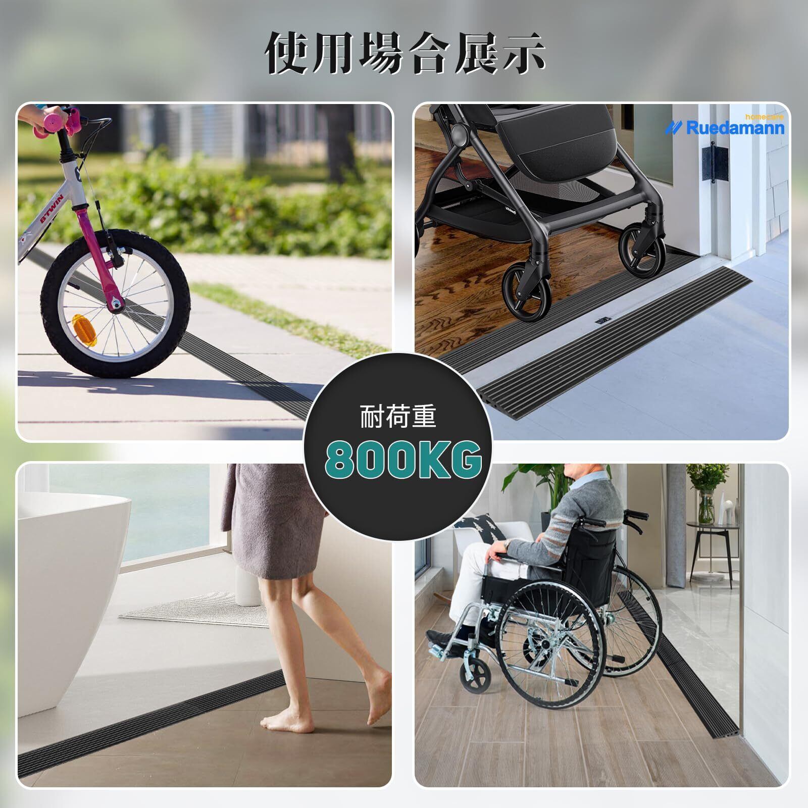 多用途:段差解消に便利なだけでなく、車用段差スロープとしても役立ちます。縁石歩道、階段、住宅、ガレージ、駐車場、工場やカーブでの入り口など様々な室内外場所に適用します。特にロボット掃除機スロープや車椅子用スロープとして活躍し、バリアフリーの環境を提供します。また、縁石スロープや室内段差スロープとして、家庭やオフィスのあらゆる段差に対応できます。