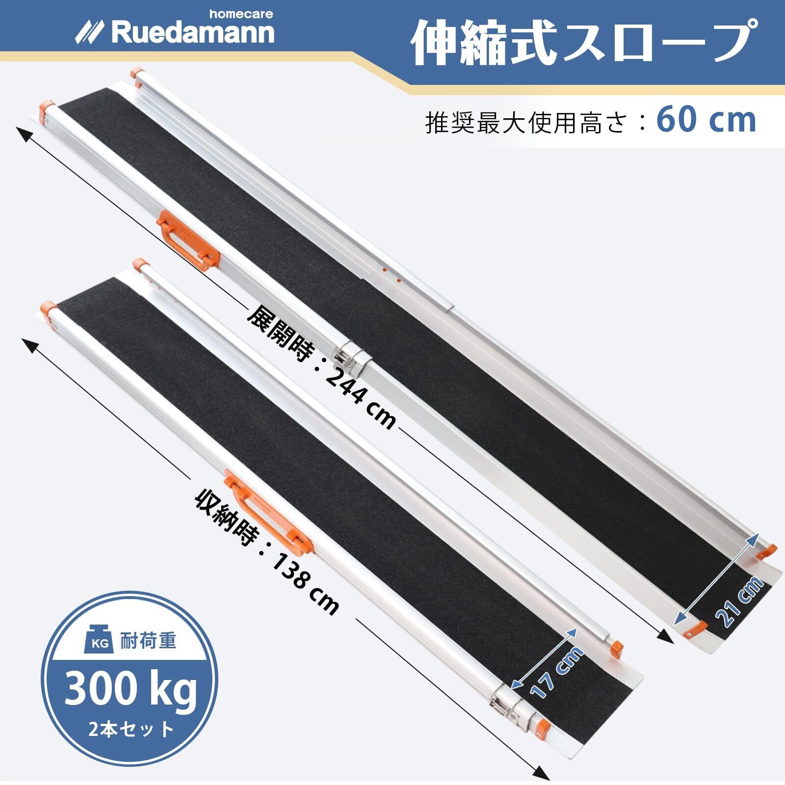 Ruedamann スロープ 車椅子 長さ138-244cm 無段階長さ調整可能 アルミスロープ 耐荷重300kg 伸縮式 段差解消 滑り止め 高齢者 障がい者への介護支援 台車 車椅子用 階段 玄関 室内外用 2本セット