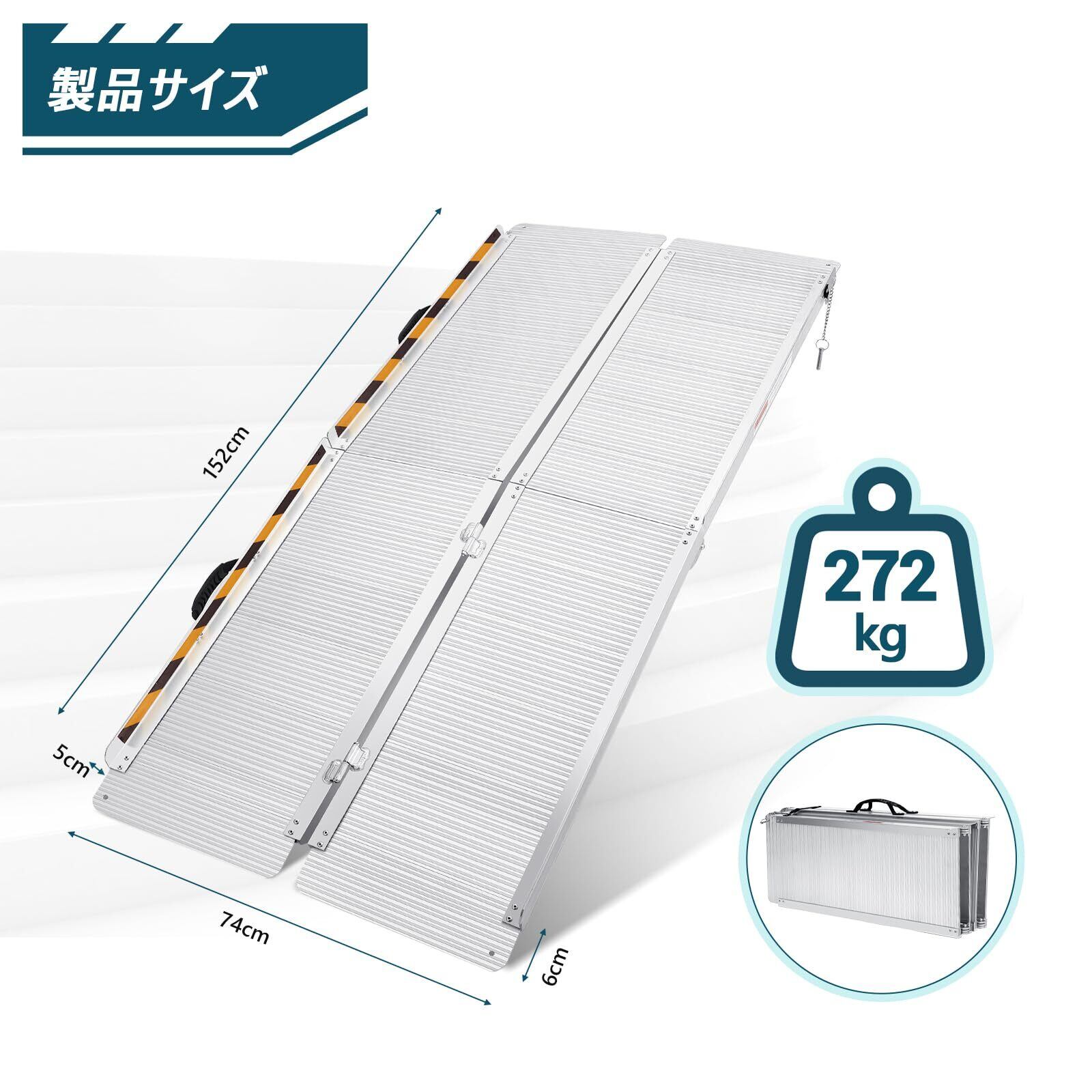 【商品仕様】段差スロープの展開サイズ:152*74*5cm 製品重さ:約11.84kg。耐荷重272kg。