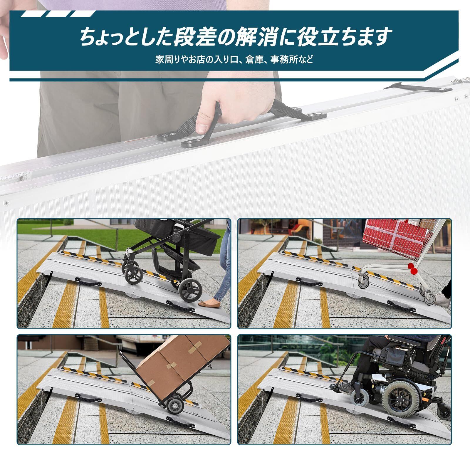 【滑り止め性能】介護用スロープの表面には特殊なストライプ模様が施され、抜群な滑り止め効果があります。使用時にズレにくく、より安全にご利用いただけます。両側はカード付き、車椅子、台車などがスムズーに上下しやすい。