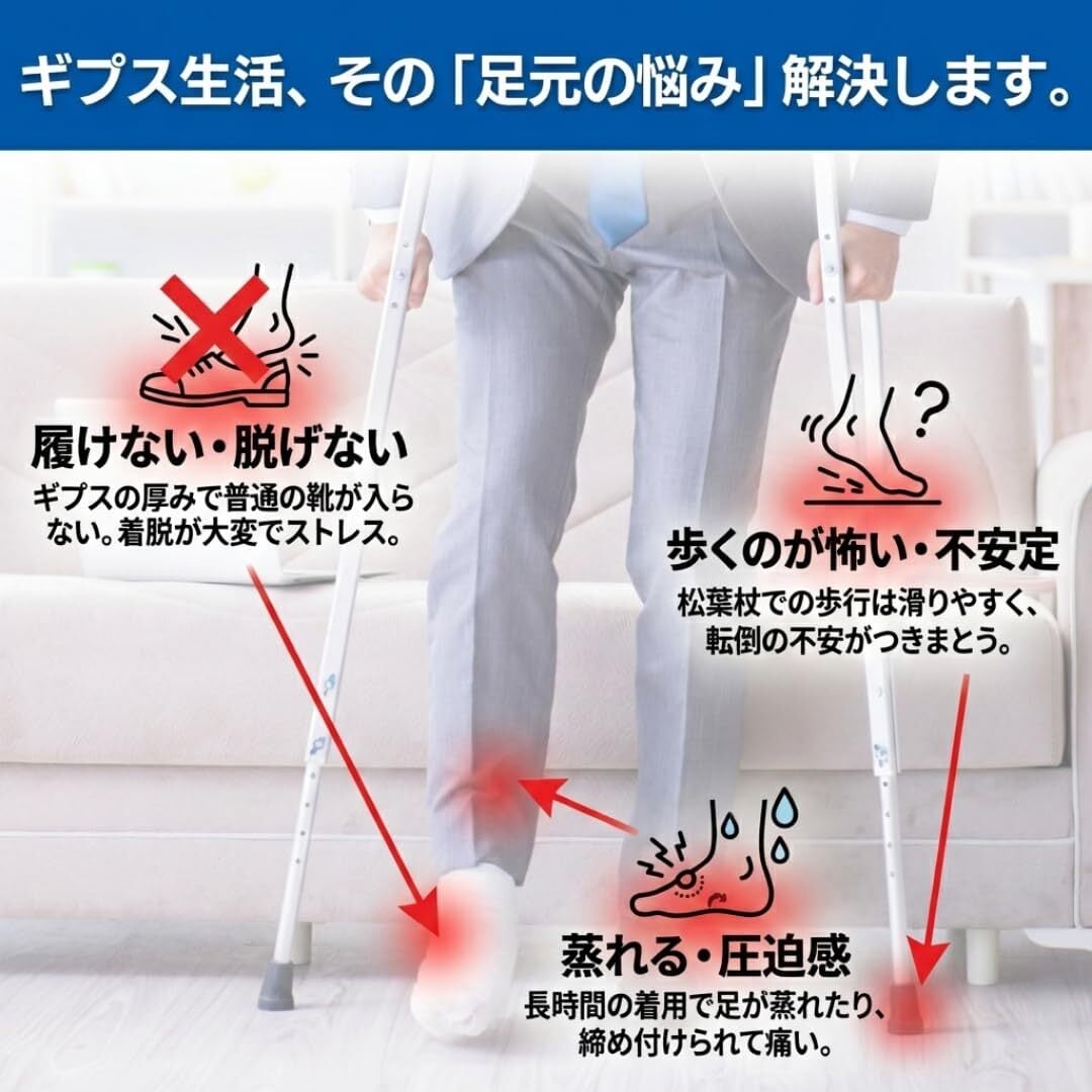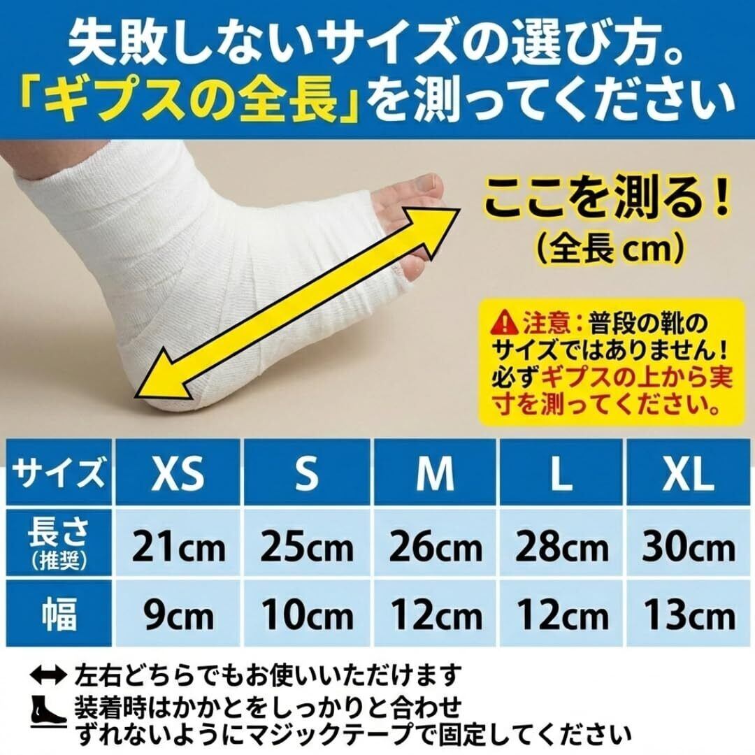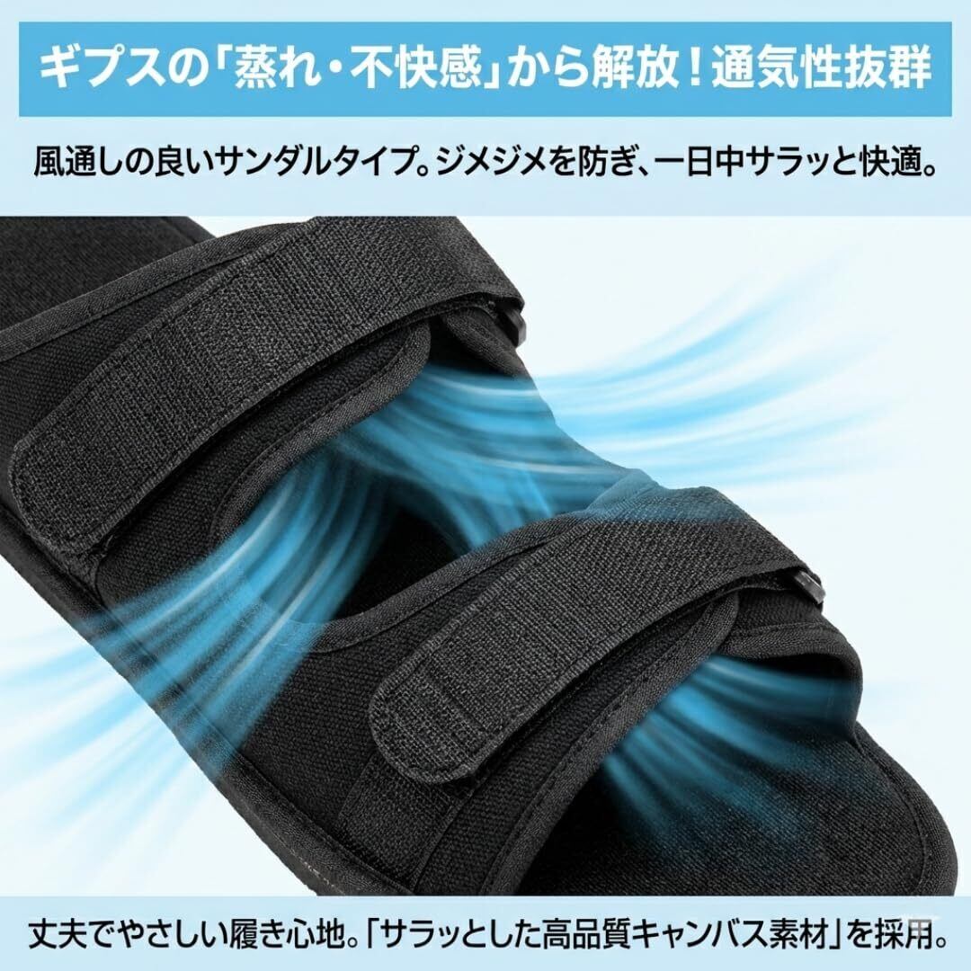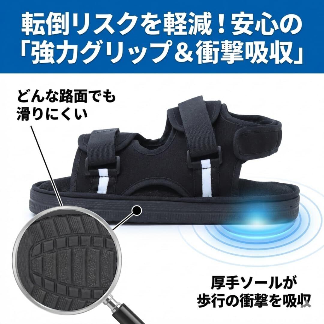 【歩行を助ける、安心サポート】歩行時の不安を解消するために設計された、滑りにくいソールとクッション性の高いサポート。足を優しく包み込むマジックテープで、ギプスをしていても快適に歩けます。開口部は広く、着脱も簡単。リハビリ中の方にも最適です。