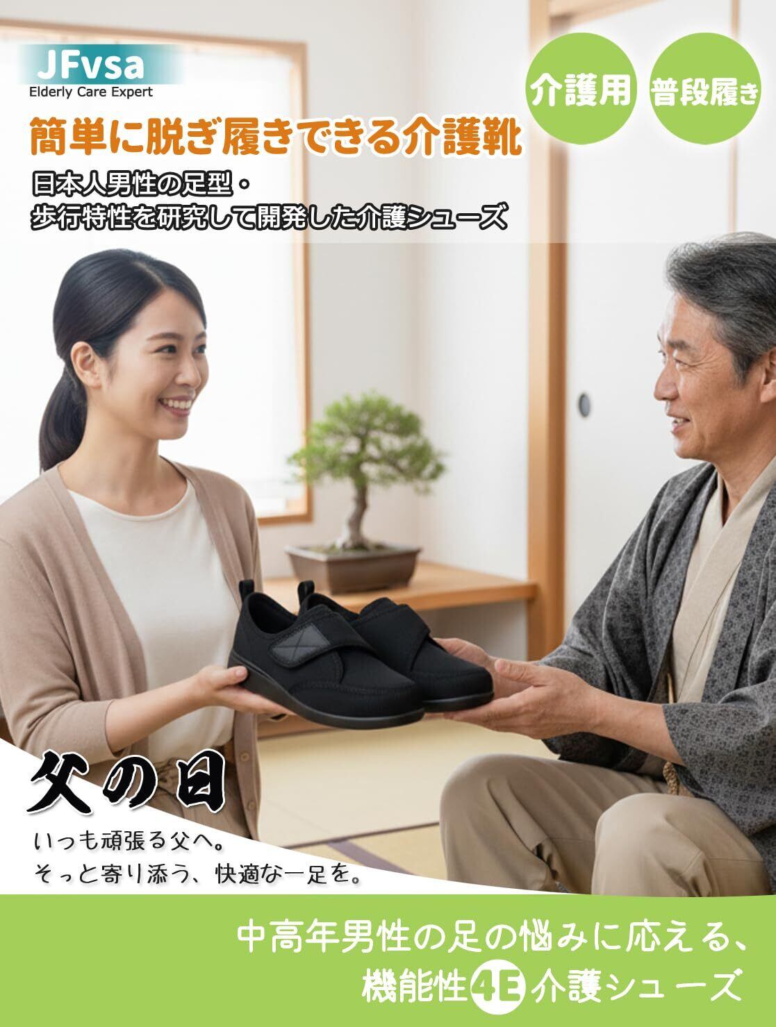 【中高年男性の足元を総合ケア】男性専用4E広幅「介護シューズ」 滑りやすい路面や施設環境にも対応した高グリップゴムソールを採用。つま先2cmの巻き上げ構造により段差でのつまずきリスクを低減し、外反母趾の進行が気になる方でも自然な歩行をサポートします。さらに、アッパーに反射素材を配置し、夜間の散歩や外出時の視認性を高め、転倒予防対策を多角的に強化しています。