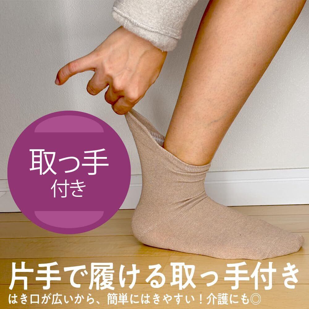 片手で履ける取っ手がついている便利な靴下。 介護や腰痛・手の力が弱く靴下が履きにくいなどのお悩みを解消する靴下です。 口ゴムもゆったりしていて履き心地抜群。 足裏には滑り止めもついていてフローリングなどで滑りにくい。 足裏部分には名前を記入する欄もあり、施設・病院などで使用するのにも便利です。 カラーも落ち着いた色でどんな服にも合わせやすいです。