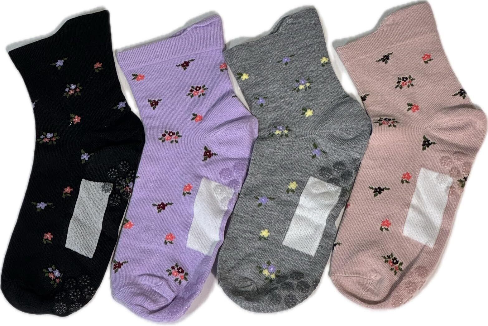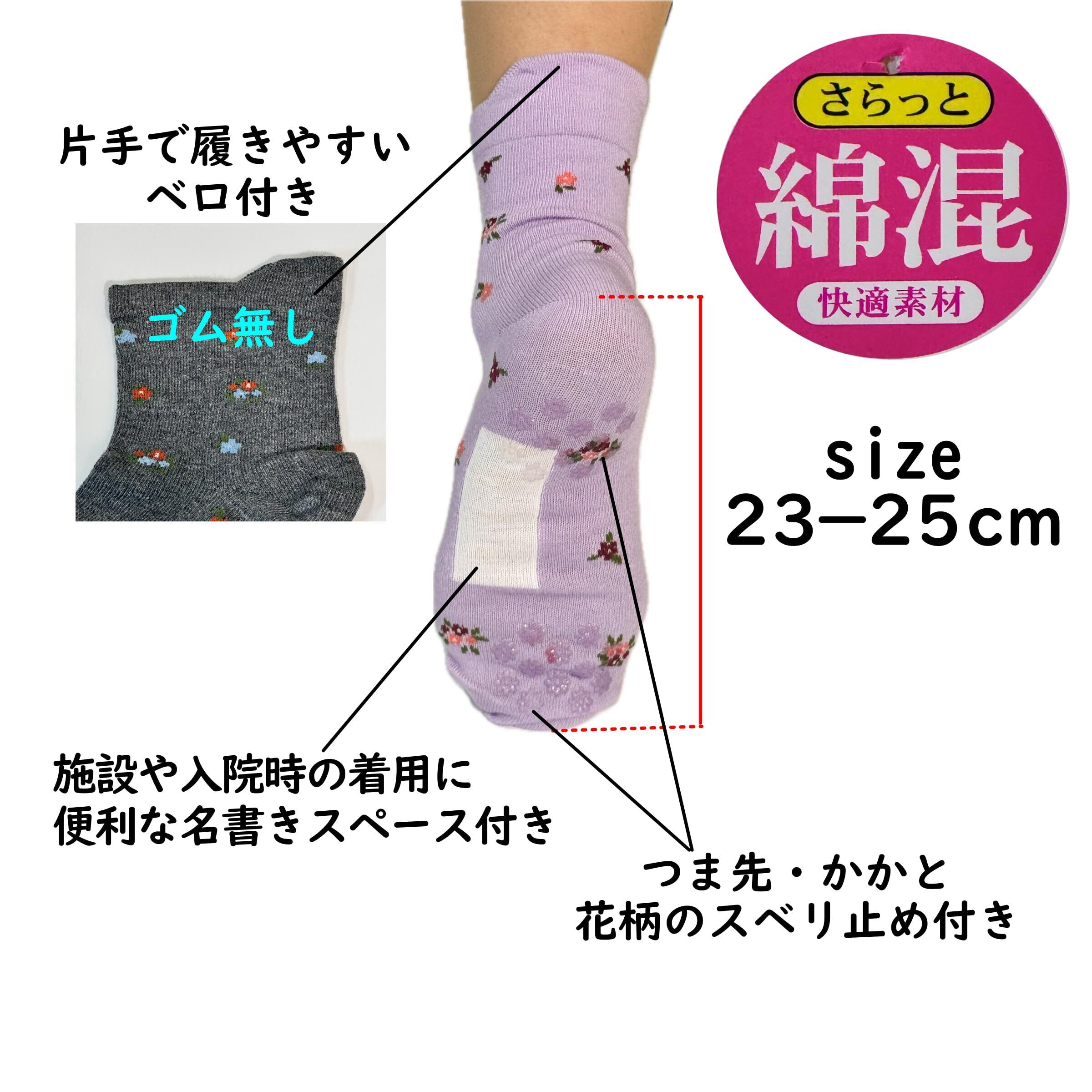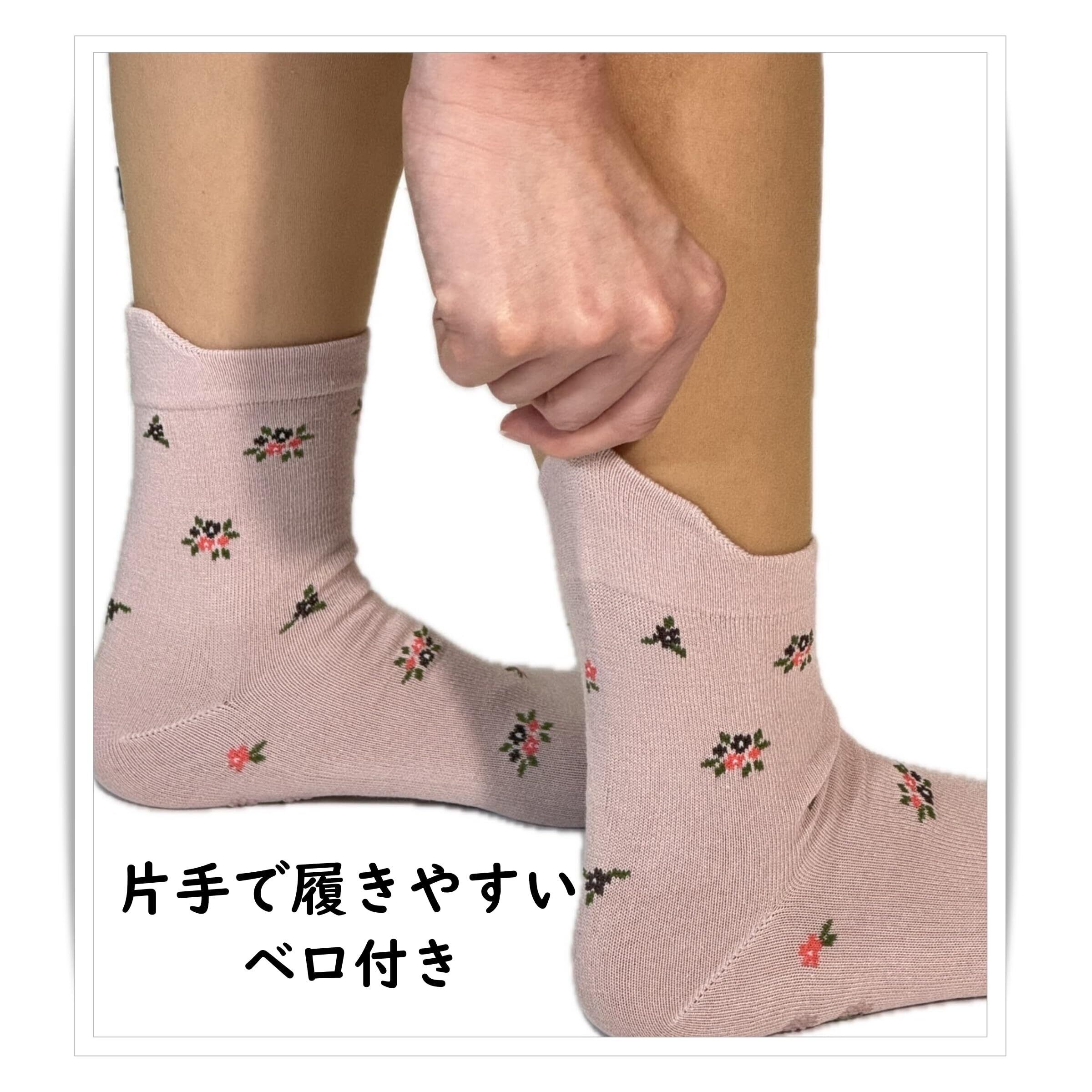 【特価セール】ソックス レディース 片手で履ける 転倒防止 滑り止め付き 名前が書ける 花柄 ベロ付き 締め付けない ゴム無し 綿混 (色おまかせ)