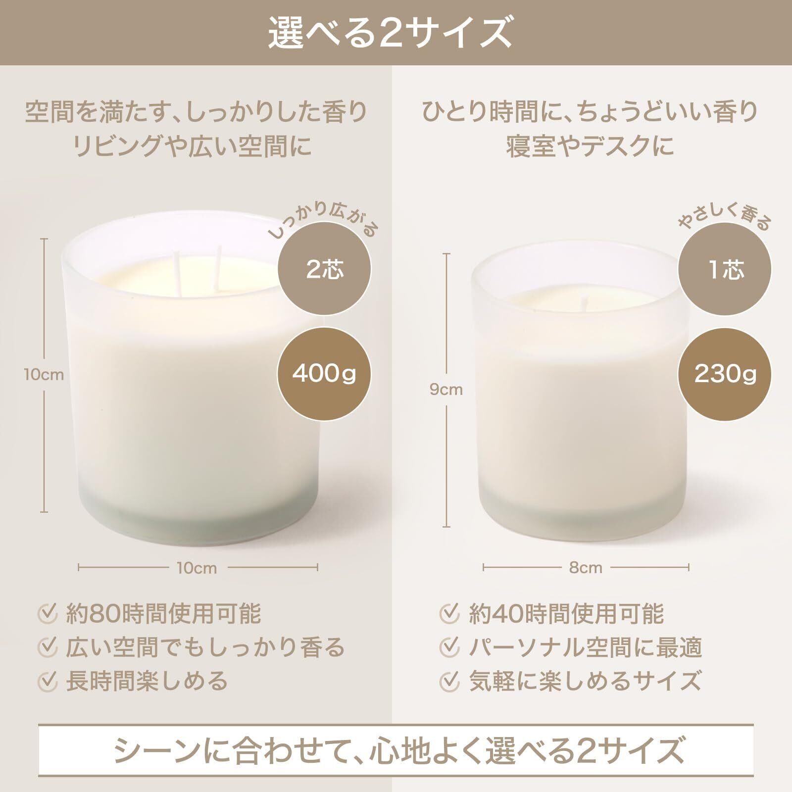 【燃焼時間】天然コットン100%の綿芯を使用したキャンドルは、炎が安定し、煙やススが出にくいのが特徴。静かにゆっくりと燃えるため、香りが優しく広がり、リラックスした空間を演出します。燃焼時間は約40時間。