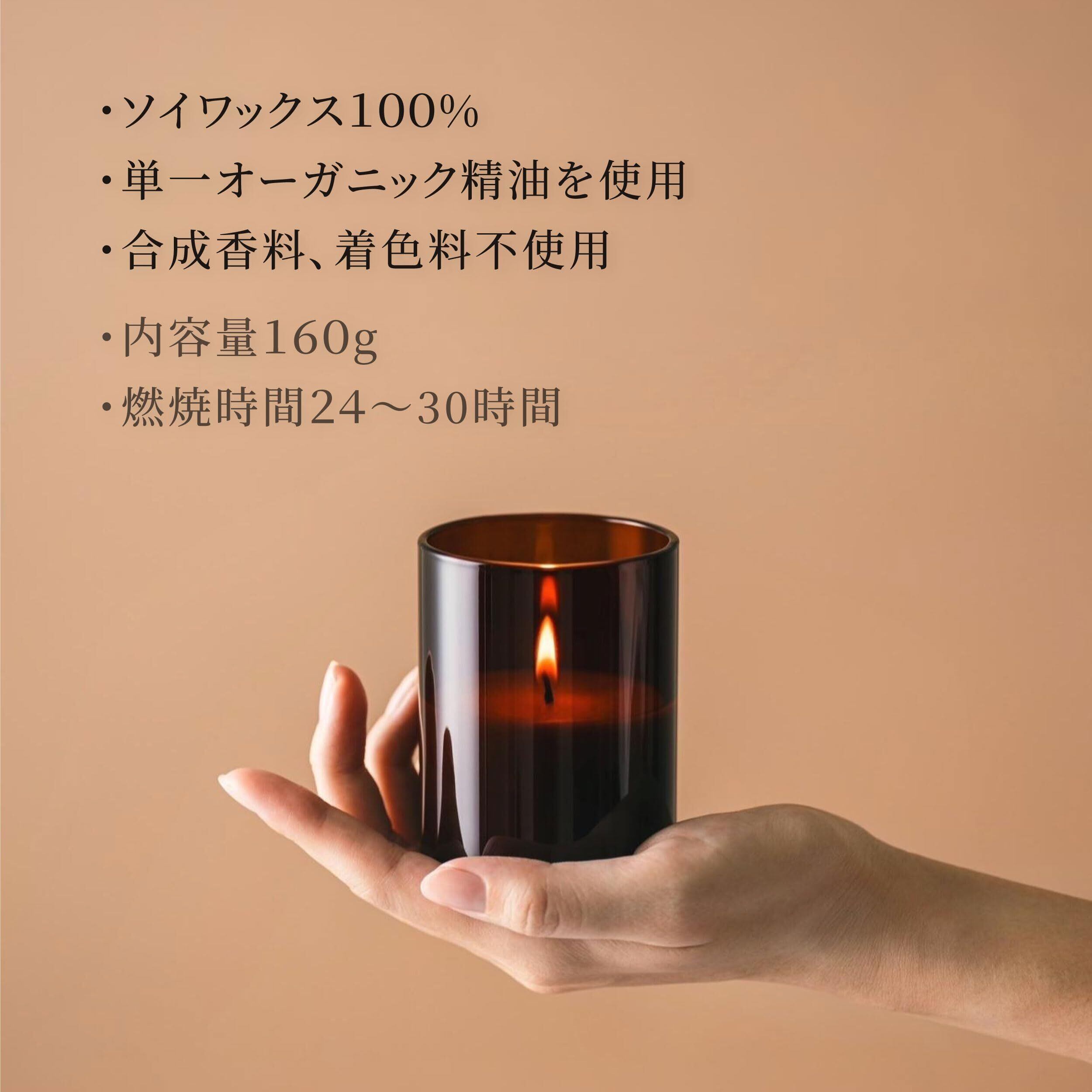 ■ 炎の美しさを楽しむアロマキャンドル 琥珀色の耐熱グラスに映る、やわらかな炎を楽しむためのキャンドル。 火を灯す時間を、静かに過ごすことを想定した設計です。