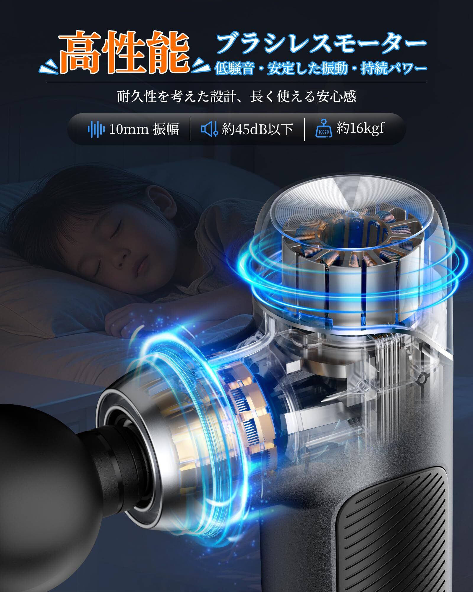 【低騒音リリースガン・握りやすく滑りにくいハンドル】高トルクブラシレスモーターに加え、安定した内部構造と減振設計により、動作音を抑えた低騒音を実現。約40dBの静音性で、早朝や夜間でも周囲を気にせず使えます。さらに、握りやすく滑りにくいハンドルを採用し、安定した筋膜リリースが可能です。電源ボタンは本体下部に配置されており、操作しやすく、使用中の誤操作も起こりにくいため、快適にお使いいただけます。