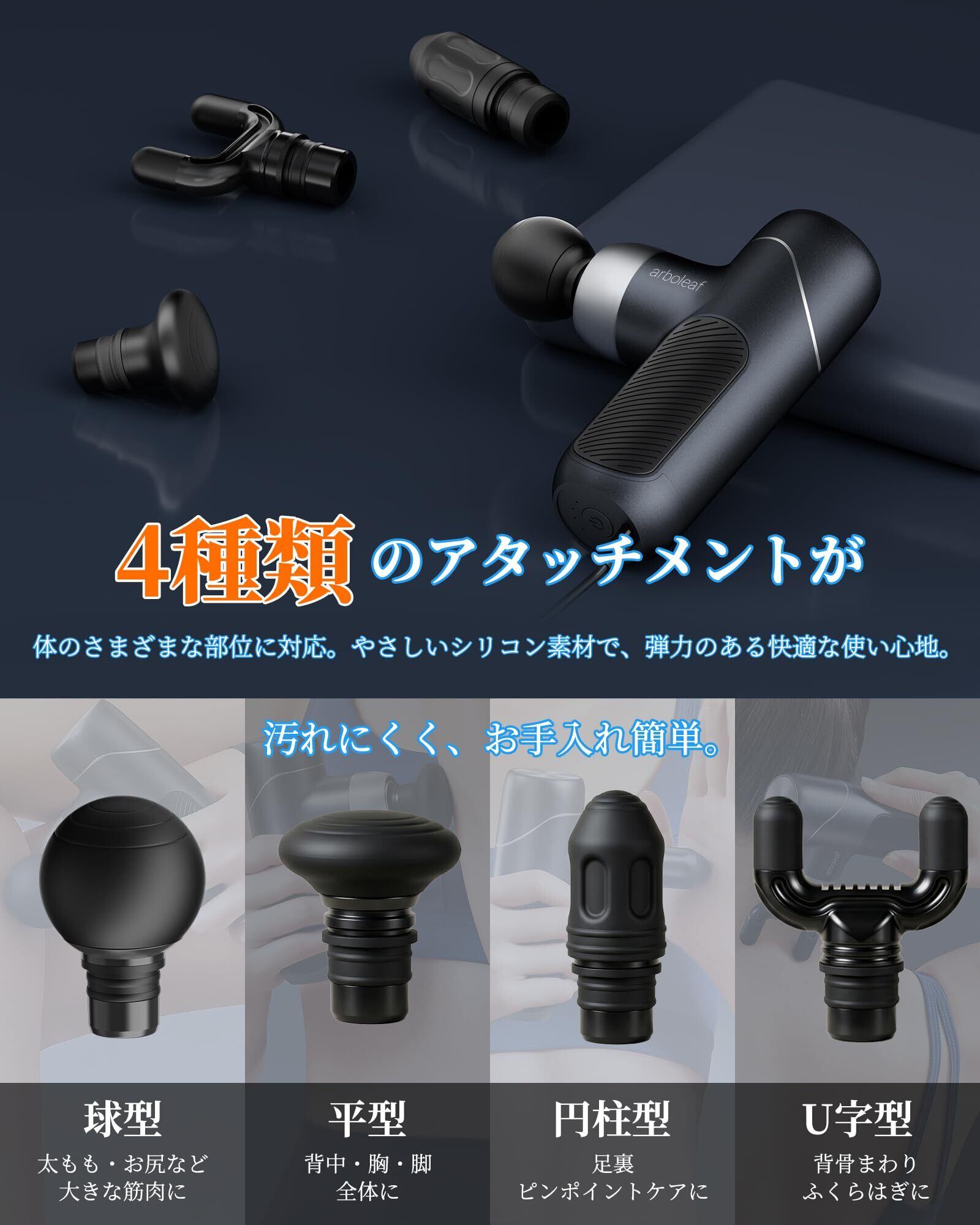 arboleaf 筋膜リリースガン 小型 筋膜ガン ハンディガン AI自適応モード搭載 きんまくリリース電動ガン 4種シリコンヘッド付属 5段階強力振動 Type-C充電 2000mAh×2 大容量バッテリー 最大12時間連続使用 370g軽量 静音 最速3000回/分 首・肩・背中・腰・太もも・足対応 全身リフレッシュ道具 ギフト/プレゼント最適 収納袋・日本語取扱説明書付き 2年間メーカー