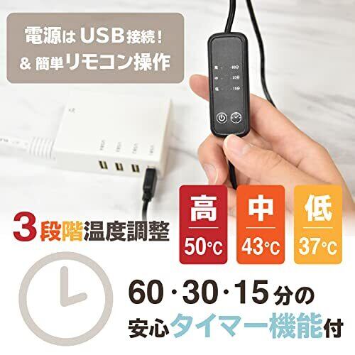 【温度設定】 三段階(高:50度 中:43度 低:37度) 【タイマー】 60分/30分/15分 【バッテリー】 2A以上のモバイルバッテリー(別売)を使用してください