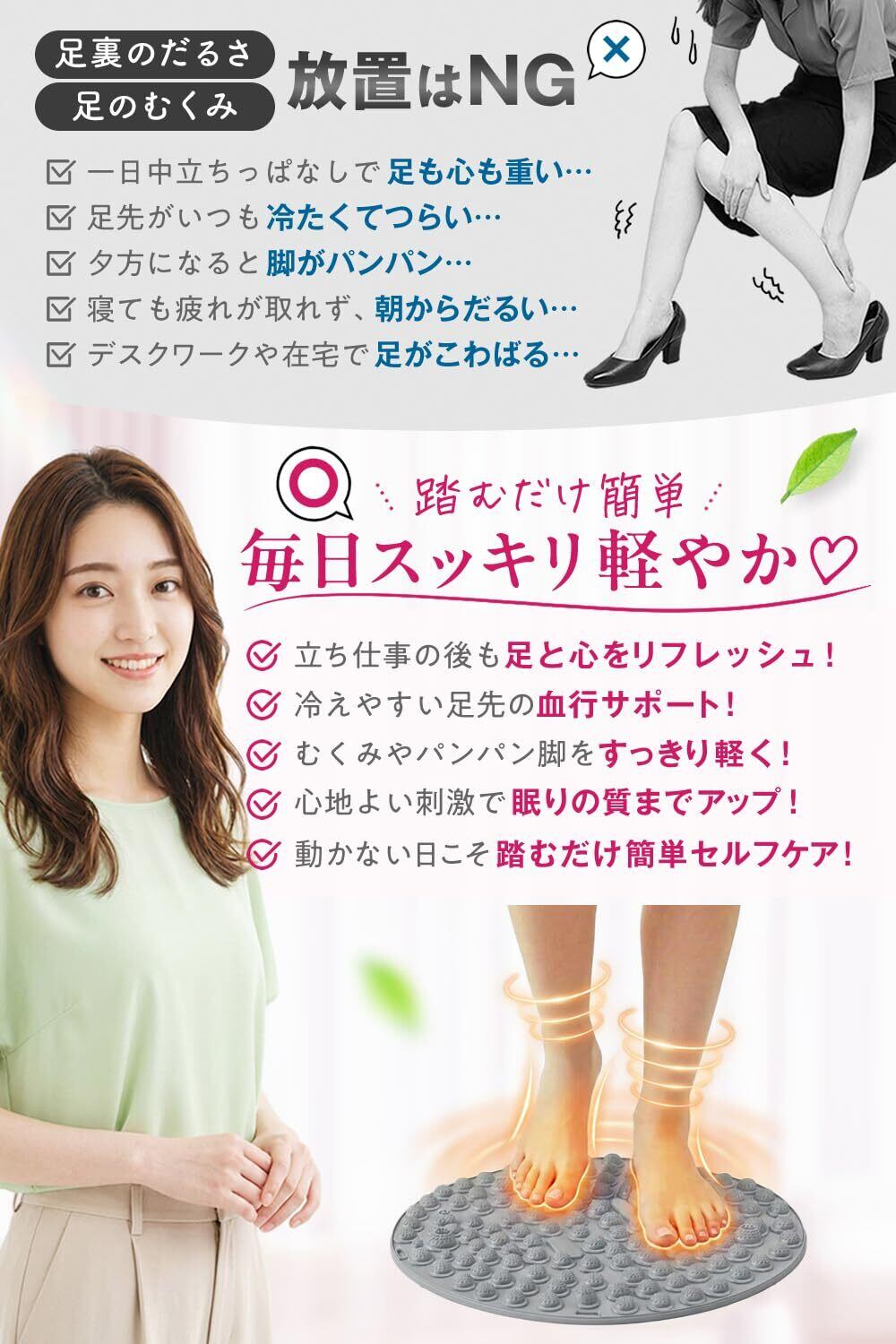 ①【足つぼマット・足裏マッサージ対応】 足裏全体を心地よく刺激する足つぼマット。 自宅で手軽に使える足裏マッサージ用パッドとして、毎日のセルフケア習慣におすすめです。 ②【指圧ボード感覚の立体突起設計】 凹凸のある突起形状が、足裏に心地よい刺激を与える指圧ボード風設計。 青竹踏みのような感覚で、立ったままでも使いやすい構造です。 ③【円形タイプで安定感のある足踏みボード】 安定感のある円形設計により、足踏み運動・立ち作業中の使用にも対応。 自宅・オフィス・リビングなど、さまざまな場所で使えます。 ④【足裏ケアを習慣化しやすい健康グッズ】 日々のリラックスタイムや、仕事・家事の合間に取り入れやすい 足裏マッサージ用健康グッズとして幅広い年代におすすめです。 ⑤【プレゼントにも選ばれる足つぼマット】 シンプルで使いやすいデザインの足つぼマット/足裏シート。 ご家族や大切な方への健康サポートアイテムとしても人気です。
