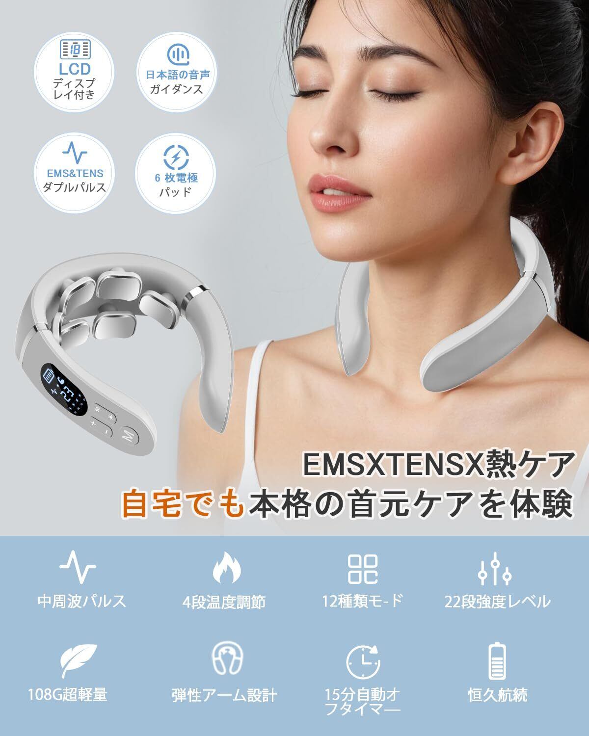 ネックケア 首 リラクゼーション器 6つパッド 温熱 EMS&TENSのW効果 12種類モード 23段階強度 静音軽量 Type-c充電式 液晶表示 日本語音声ガイダンス 簡単操作 男女兼用 出張 旅行 職場 プレゼント日本語説明書