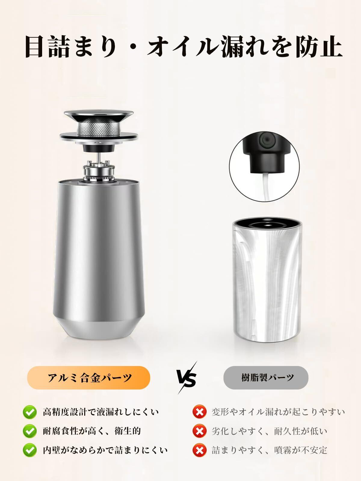 【詰まりや液漏れを抑える構造設計】噴霧パイプにはアルミニウム素材を採用し、耐腐食性・耐熱性に配慮した設計です。綿芯や樹脂部品を使用した製品と比べ、長時間使用時でも噴孔の詰まりや液漏れが起こりにくく、安定した使用感を保ちます。