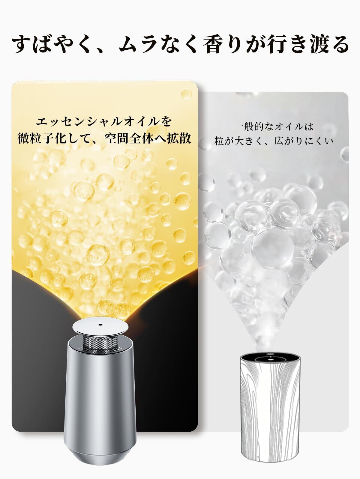 【素早く広がる、ムラのない香り】独自の噴霧構造により、微細なミストを生成。一般的なディフューザーよりも細かく分散されるため、使用開始後すぐに香りが空間全体へ均一に広がり、快適で落ち着いた雰囲気を演出します。